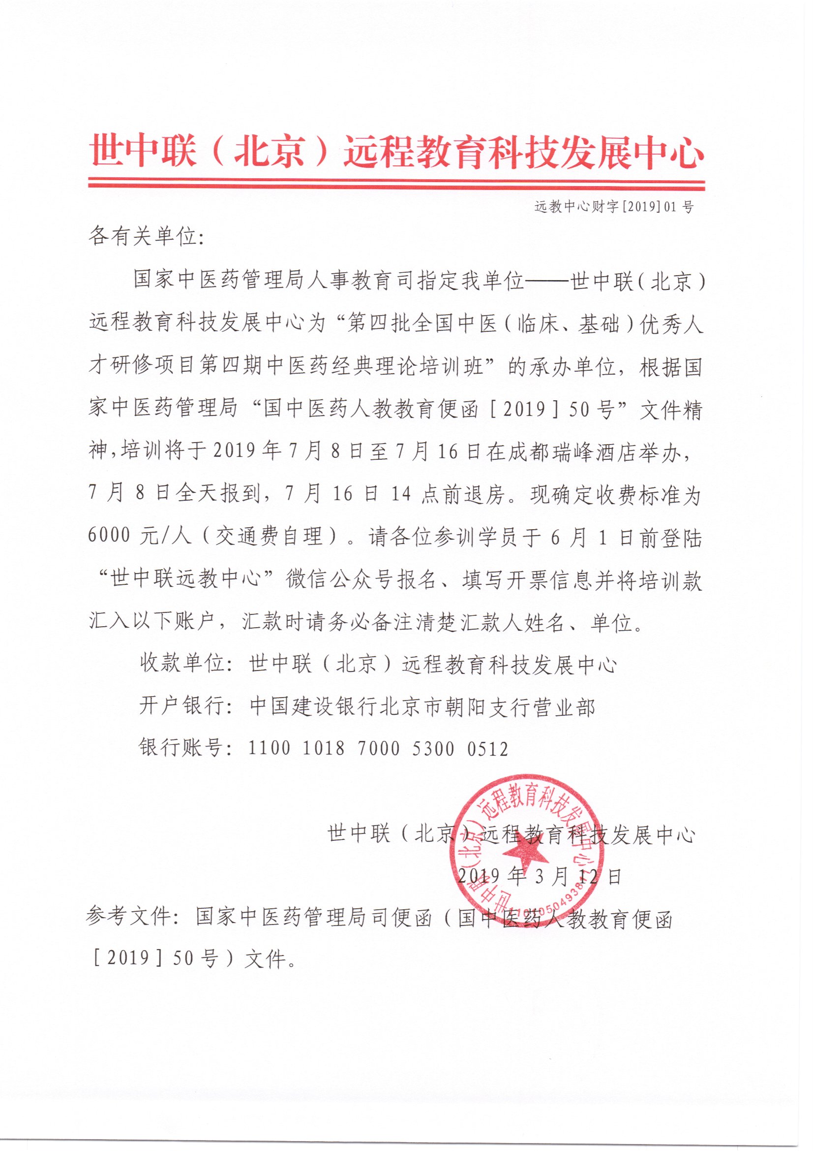 第四批全国中医(临床、基础) 优秀人才研修项目第四期中医药经典培训班收费通知