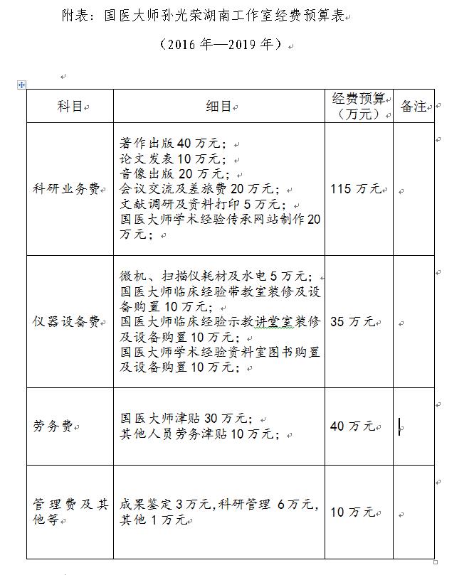 附表:国医大师孙光荣湖南工作室经费预算表(2016年—2019年)